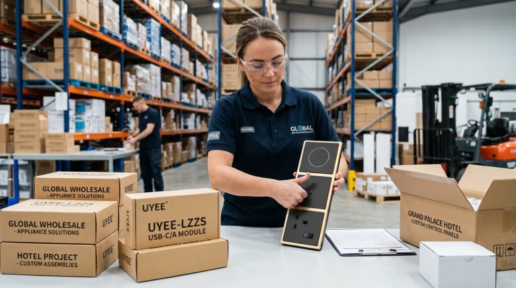 Because you stock UYEE-LZZS modular components, you say “Yes” instantly. Your warehouse team walks down the aisle, pulls a 4-gang Matte Black frame, snaps in one switch module, two USB-C modules, and one universal socket module. You assemble the entire bespoke order locally in a single afternoon and deliver it to the job site the very next morning.