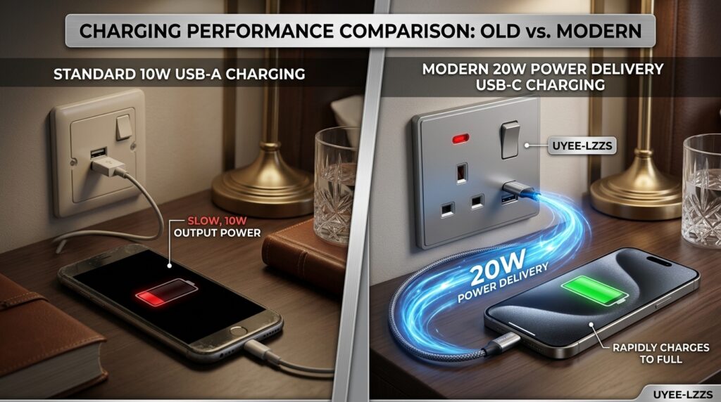 To understand the necessity of UYEE-LZZS’s advanced USB-C modules, we must first analyze the failure of legacy systems. For the past decade, hotels and airports have installed 5V/2.1A (10.5W) USB-A ports. While adequate for early smartphones, these ports are entirely incapable of supporting modern lithium-ion battery demands.